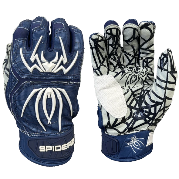 These 2023 Spiderz HYBRID Batting Gloves: Navy/Gold models are available from Youth Medium to Adult 2XL and ships fast and free right here at headbangersports.com!