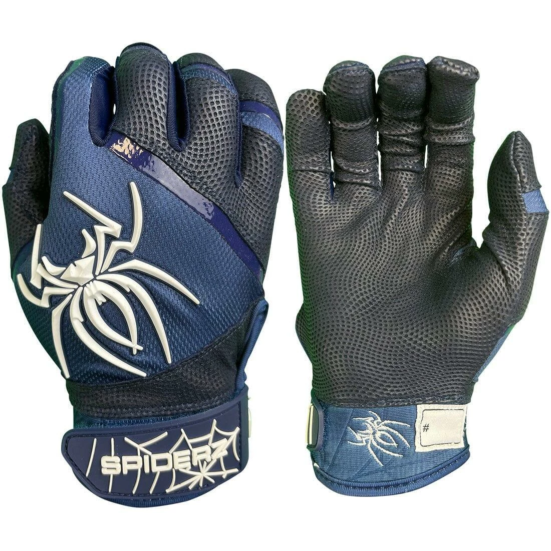 The brand new 2023 Spiderz Pro Model Navy Blue & White Batting Gloves offer a brand new Thin, Premium, Super Soft, Indonesian Palm for 2023! An upgraded wrist strap for more durability was a must, and increased flexibility on your knuckles! This model is designed to ensure comfort, durability, and an amazing Feel of the bat!Â