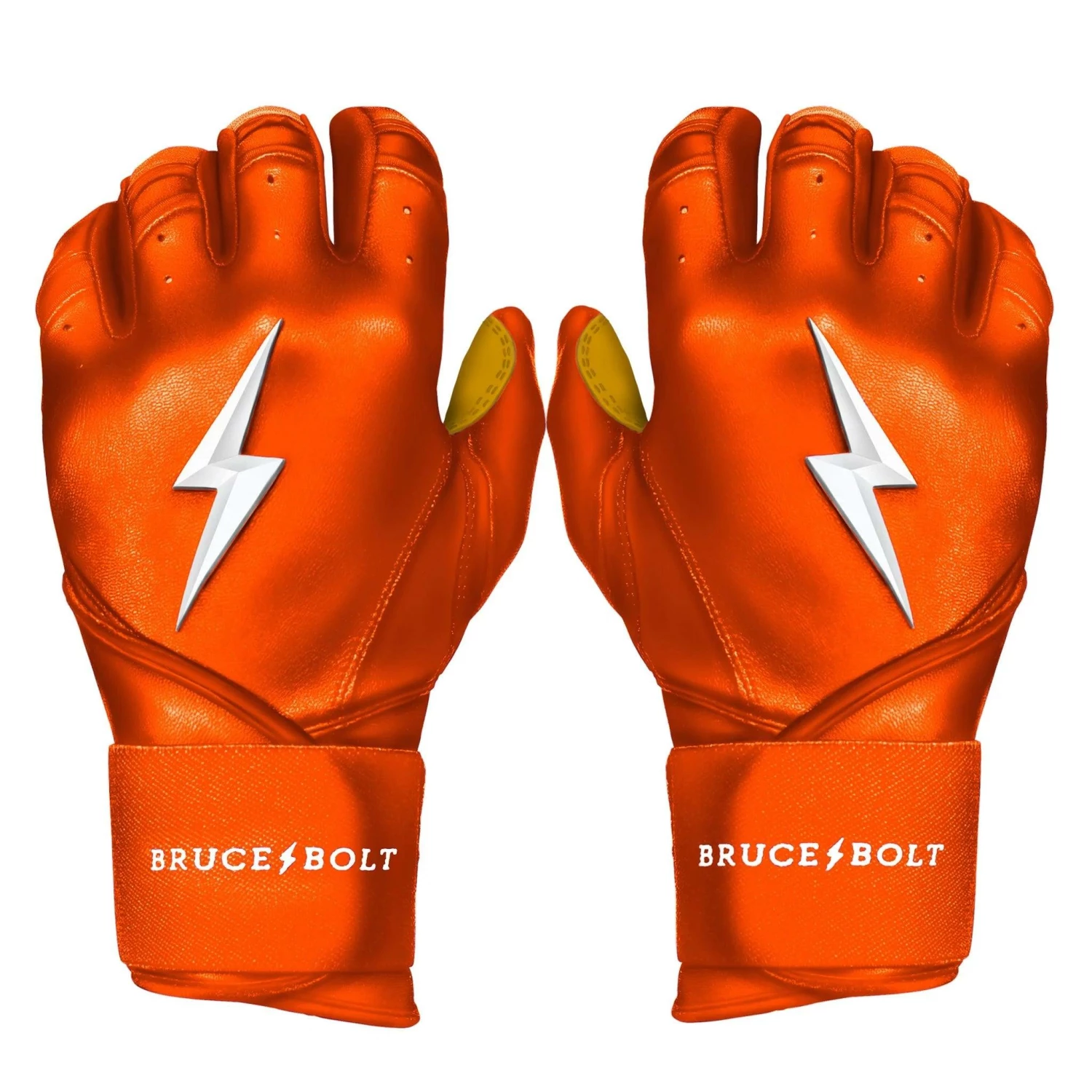 Each pair of Bruce Bolt Premium Pro Long Cuff Orange Batting Gloves are handmade by skilled craftsmen using only the highest quality 0.9mm Cabretta leather and stitching techniques which makes Bruce Bolt gloves buttery soft but more durable than any other glove on the market.