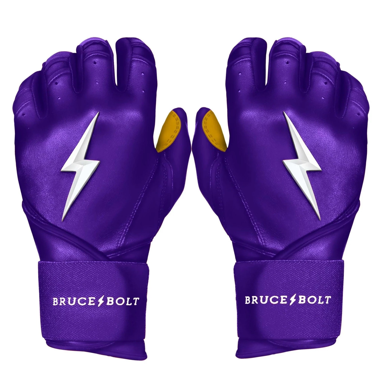 Each pair of Bruce Bolt Premium Pro Long Cuff PURPLE Batting Gloves are handmade by skilled craftsmen using only the highest quality 0.9mm Cabretta leather and stitching techniques which makes Bruce Bolt gloves buttery soft but more durable than any other glove on the market.