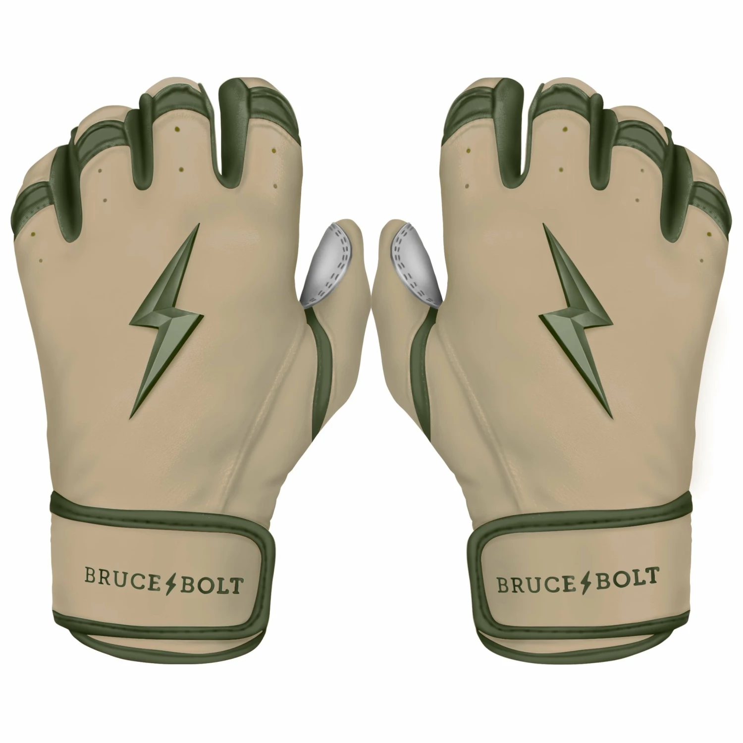 Each pair of Bruce Bolt Premium Pro MILITARY Series Short Cuff Blue Batting Gloves are handmade by skilled craftsmen using only the highest quality 0.9mm Cabretta leather and stitching techniques which makes Bruce Bolt gloves buttery soft but more durable than any other glove on the market.