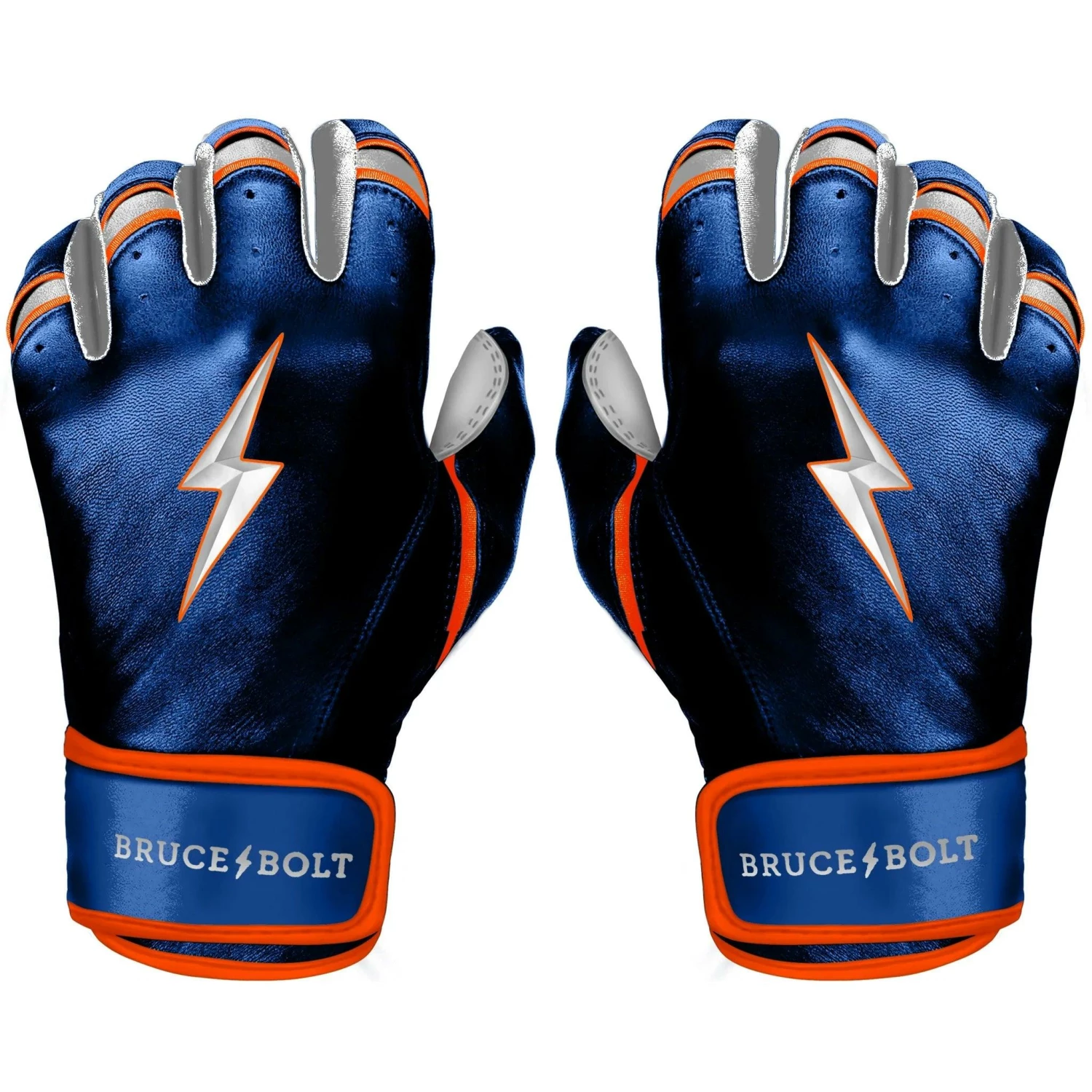 Each pair of Bruce Bolt Premium Pro NIMMO Signature Series Short Cuff Blue Batting Gloves are handmade by skilled craftsmen using only the highest quality 0.9mm Cabretta leather and stitching techniques which makes Bruce Bolt gloves buttery soft but more durable than any other glove on the market.