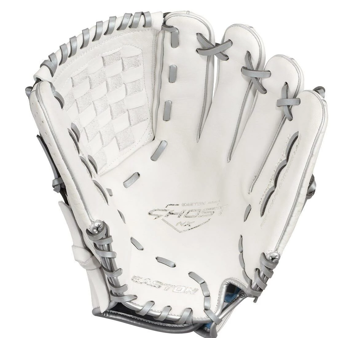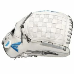 Easton’s Ghost series is a symbol of elite fastpitch play. The Ghost NX 12.5-inch Fastpitch Pitcher/Infield glove fits right in. These gloves were crafted in gameday-specific patterns designed for smaller hands and perfectly suited to the fastpitch game. On the outside, the Game Ready Diamond Pro Steer leather and Flex Notch closure system make this glove super soft and easy to handle right away. The Quantum Closure System on the glove back ensures a perfect fit for every player, and the interior Ax Suede microfiber lining creates unmatched comfort and durability. Also, the striking white-and-blue colorway and professional-grade silver metallic rawhide lace are sure to turn heads.