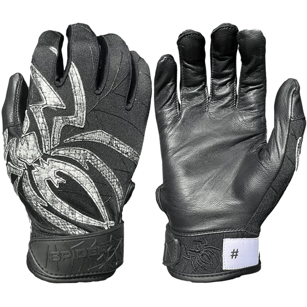LIMITED EDITION “Black Mamba” PRIZM model. The Black Mamba features a smooth & soft black leather palm, flexible polyester top hand fit, triple reinforced wrist strap and our Spiderz logo in a faux snake skin material.