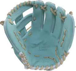 M Type fit system provides integrated thumb and pinky sleeves with enhanced thumb stall cushioning to maximize comfort and feel. The Marucci Palmetto 12″ fastpitch softball glove offers a deep pocket and tapered hand stall which provides a better fit and fielding control. This infield softball glove is built for the female infielder looking for a beautiful mint blue colorway.