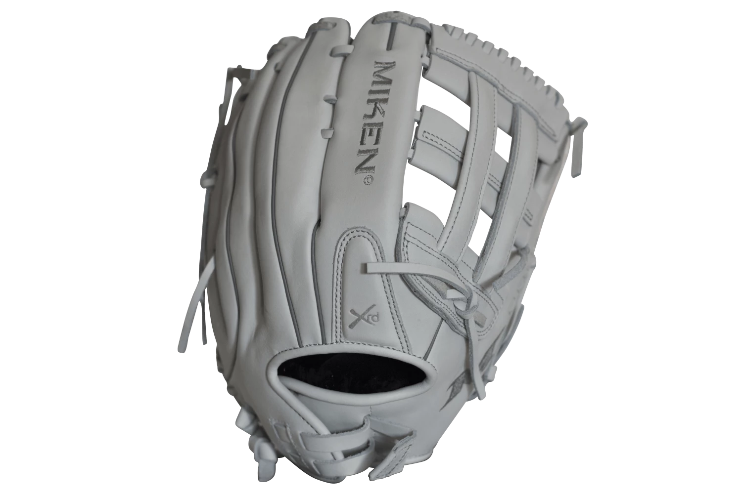 Let us help you gear up for the 2019 year with this 13″ White on White Slowpitch Softball Fielding Glove, featuring Mikens Pro H-Web Pattern designed for adult softball. Order today with our fast free shipping here at headbangersports.com!Â