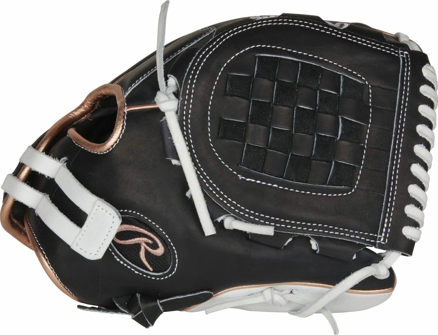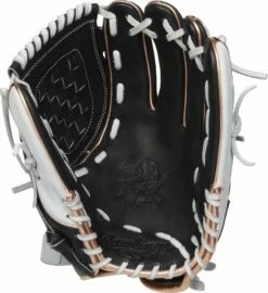 In addition, this black shell glove with white trim and rose gold welting and binding features a padded thumb sleeve for optimal comfort, and an adjustable Pull-Strap back. This means you get a ‘custom fit’ and more glove control every inning you’re on the field.
