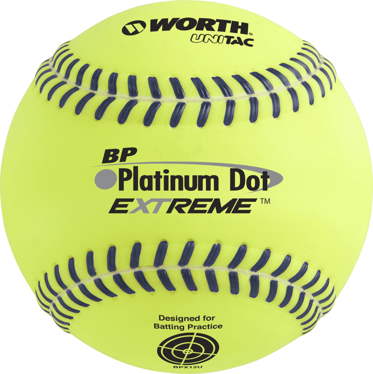 Introducing the new Platinum Standard in BP Balls. Worth’s new Super Platinum Dot Extreme Batting Practice Ball is a one piece, seamless ball that changes the way you take BP. Utilizing Worth’s new UNITAC cover technology, recreate your game swings with a ball designed to hold COR and Compression while minimizing damage on your bats.Â